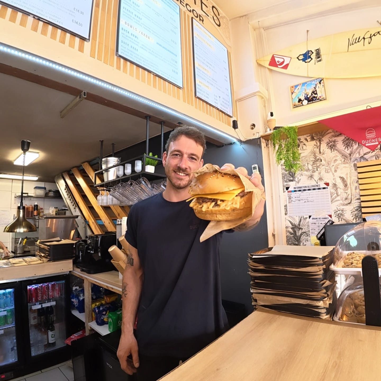 Derrière chaque burger au canard qui régale à Hossegor, il y a surtout une équipe passionnée ! Chez Duckes, on partage bien plus que l’amour du bon produit : ici, chacun met la main à la pâte pour faire briller les Landes à travers des burgers savoureux et généreux. Du grill à l’assiette, en passant par l’accueil, notre équipe donne le meilleur pour vous faire passer un bon moment… et ça se goûte !